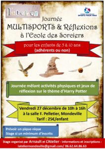 Pour patienter avant Noël, 14 enfants de Mondeville et Videlles ont eu la joie de passer une journée sur le thème de Harry Potter. Mêlant sports et énigmes, ils se sont bien défoulé en ce début de vacances de Noël… Bravo à Arnault, notre animateur du Multisport pour cette journée !